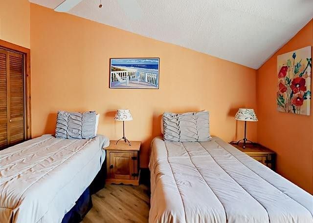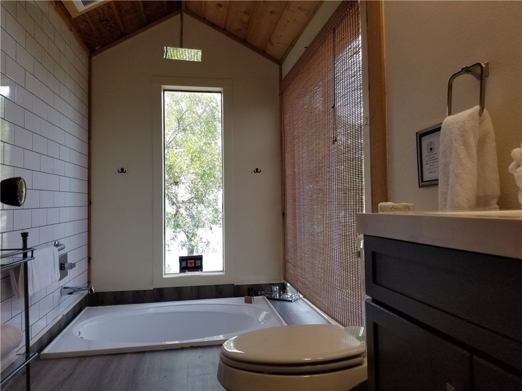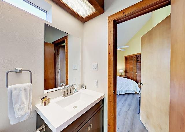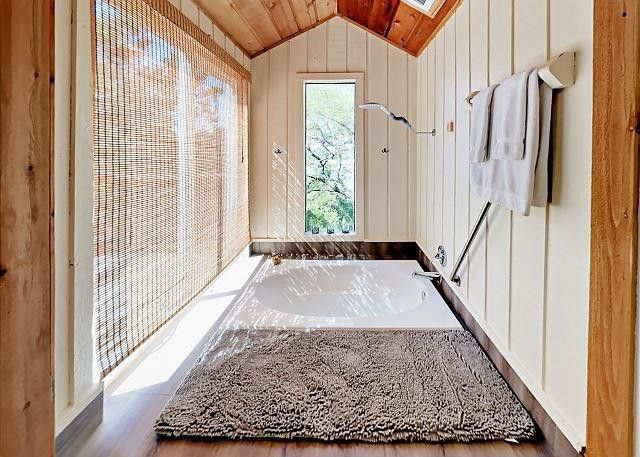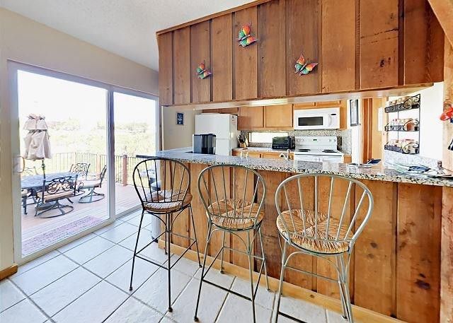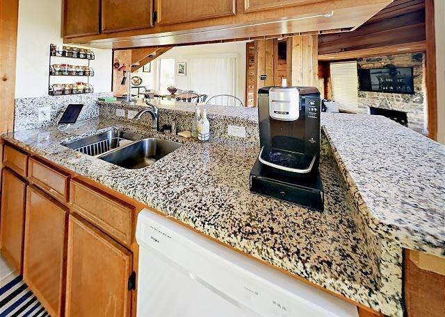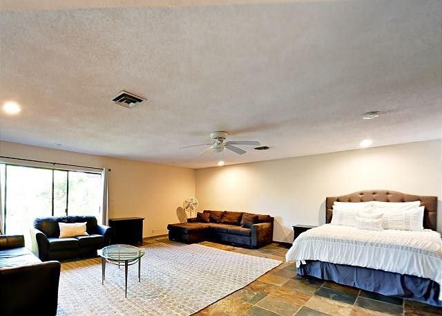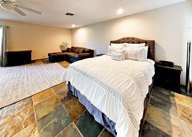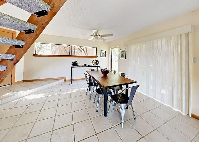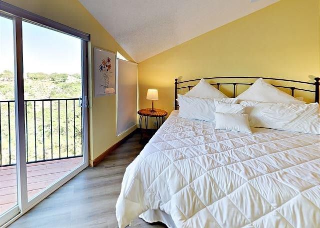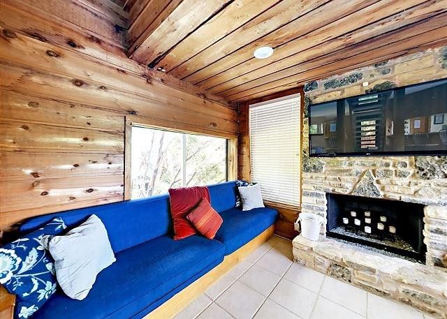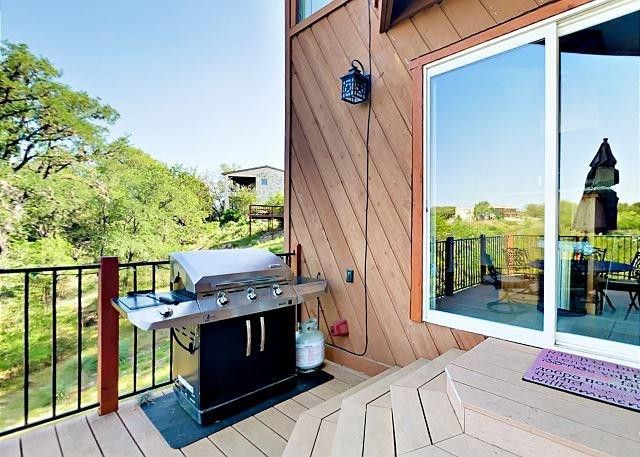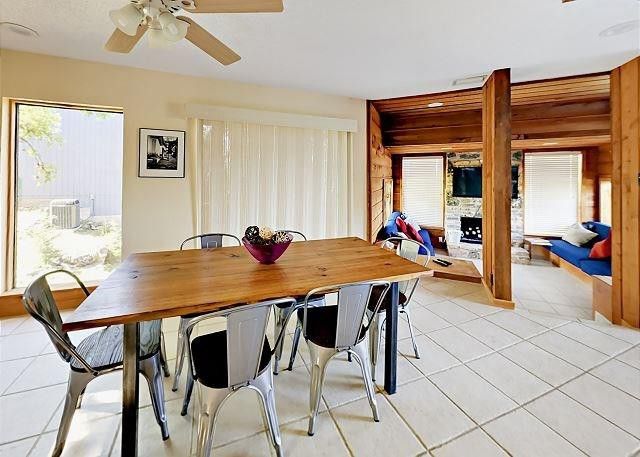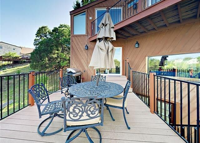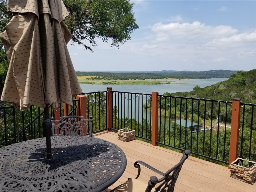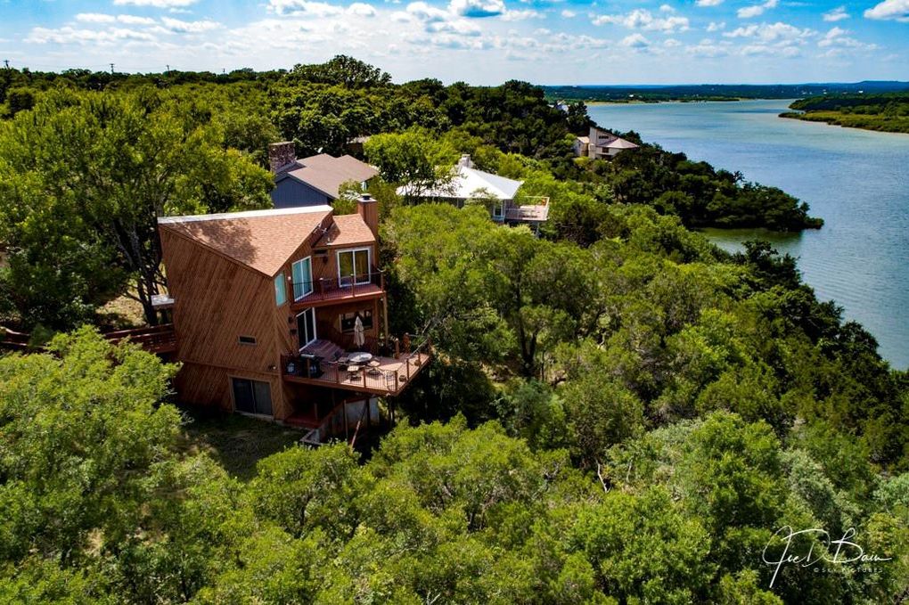 Cool cabin style with Two Masters upstairs, and a large room below that has been made into a Kids dorm with their own living room. Granite counters in the kitchen. Wood burning fireplace in a cool sunken living room.Decks overlooking beautiful Lake Travis.