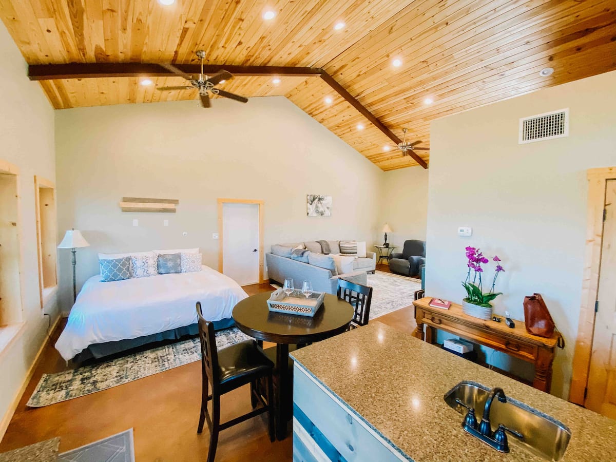 Beautiful studio Barndominium with one large studio/efficiency room, private bathroom and laundry room. The living quarters are a private portion of the barndominium.