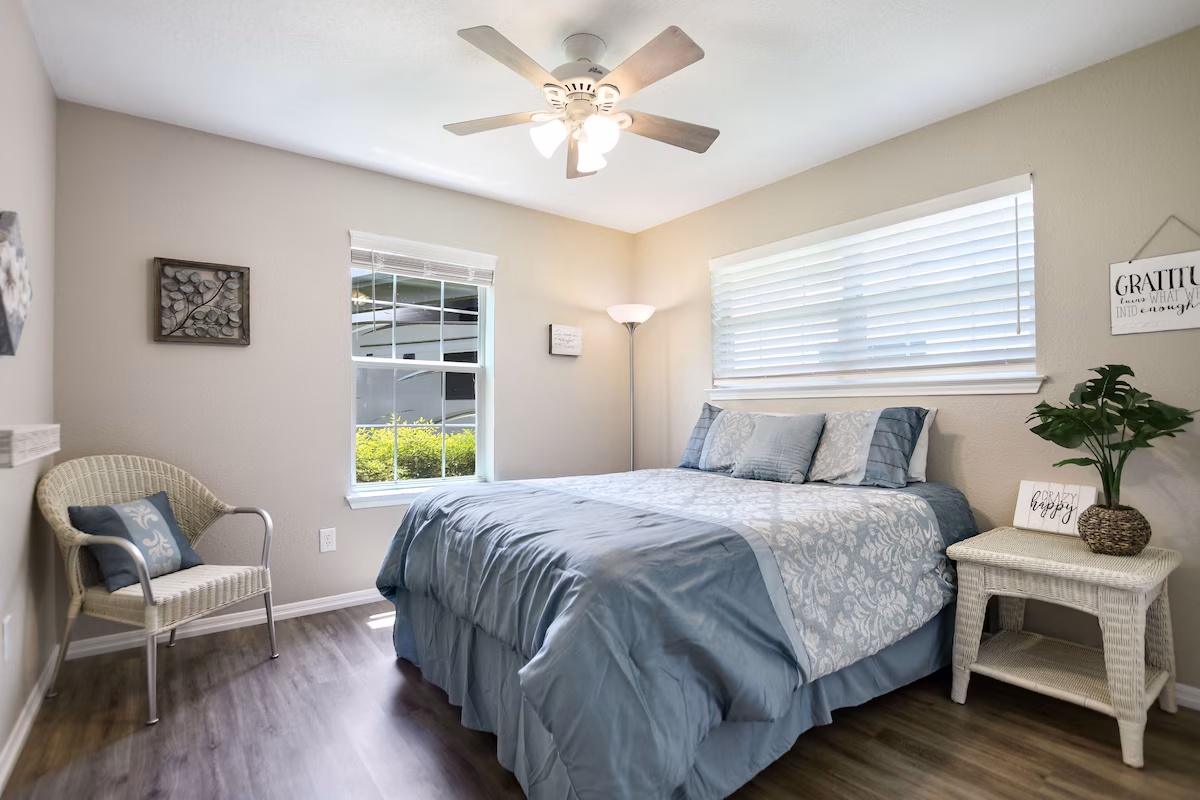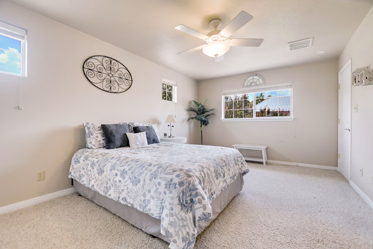 This home has 2 levels, with the master bedroom and 2 bedrooms downstairs, and a 4th large bedroom upstairs with a loft. Each of the 4 bedrooms has a queen size bed, and the loft is furnished with 3 twin beds plus a full size futon. In addition, the downstairs living room as a fold-out sleeper sofa.