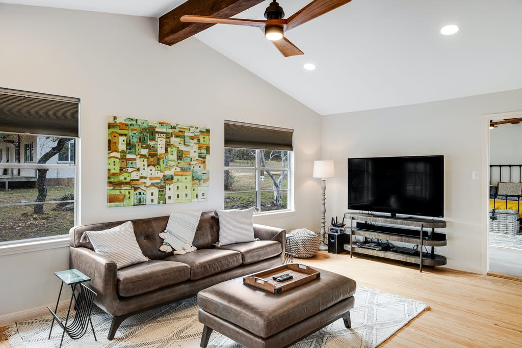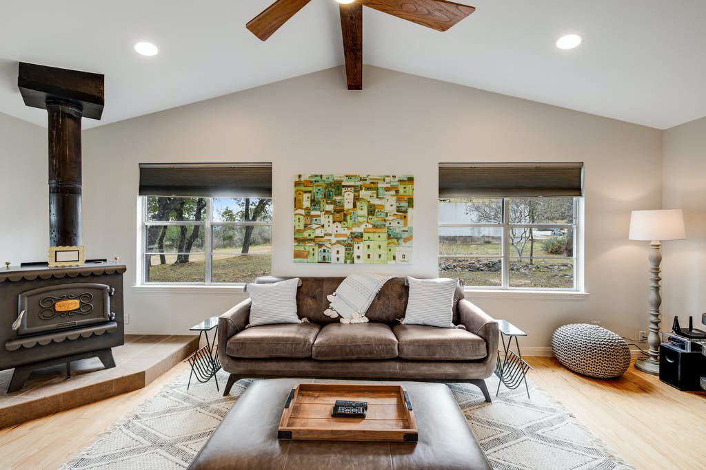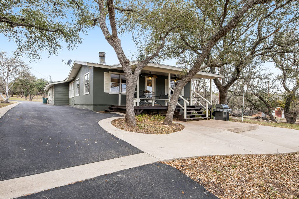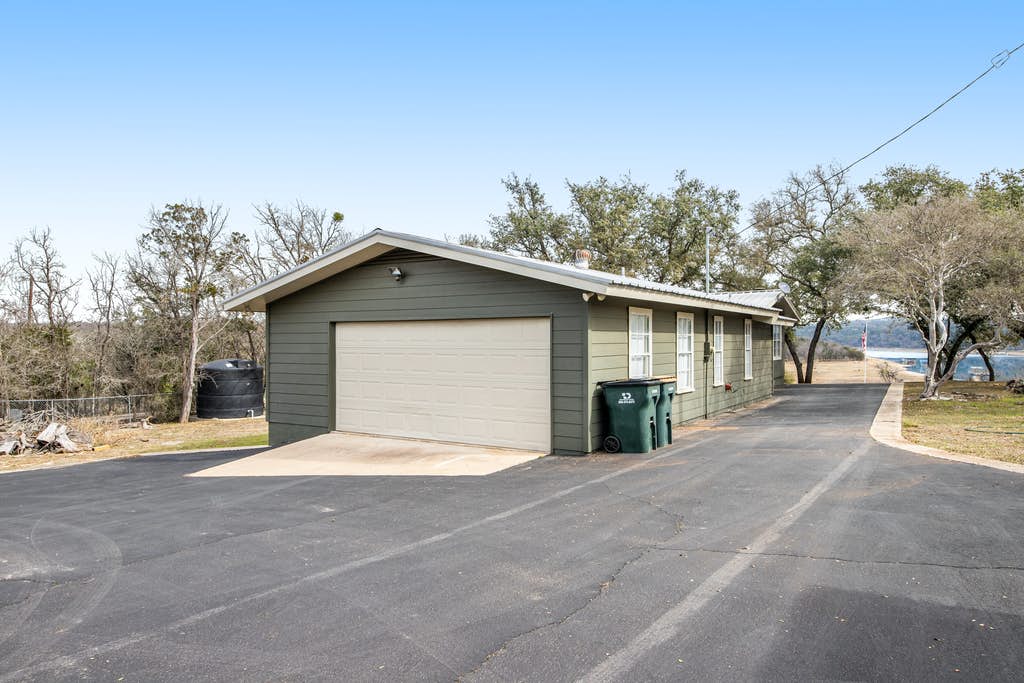 You’re going to love staying in this lovely waterfront home located on a sprawling two-acre property, just steps from Lake Travis! Inside, burnished wood accents and a handsome decorative stove highlight the interior, and you can spread out over the comfy furniture after a day down on the private waterfront. Watch a good movie or show on the large flatscreen TV then head into the kitchen to take advantage of the stainless steel appliances and ample counter space to prepare a world-class meal. Serve your dinner guests at the table with seating for four or outside on the furnished porch for an al fresco dining experience.
