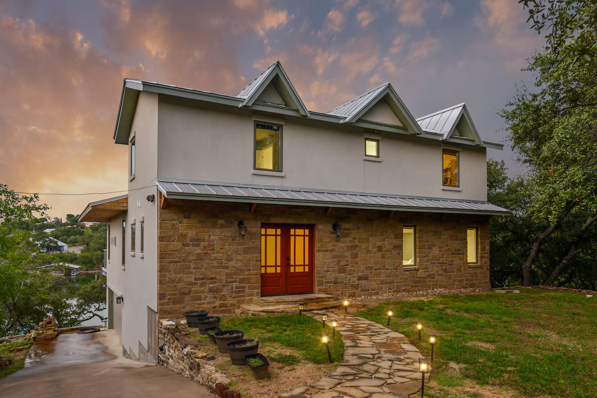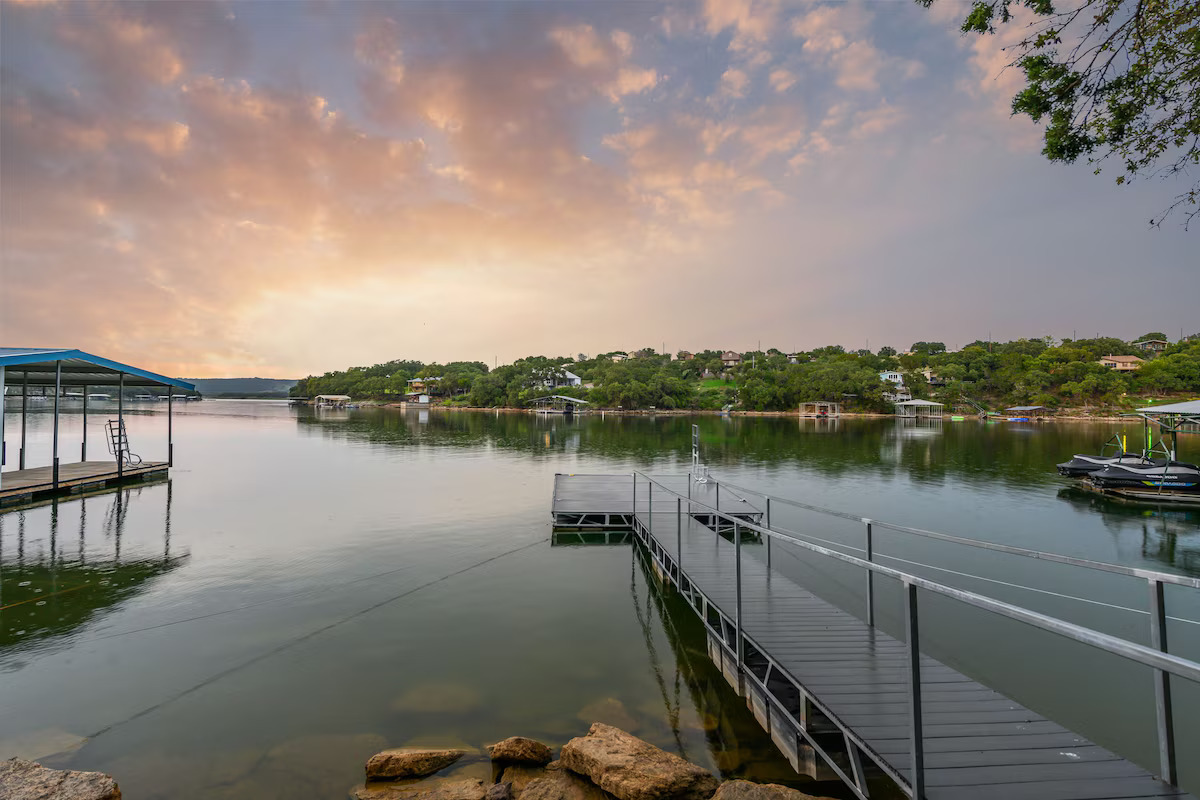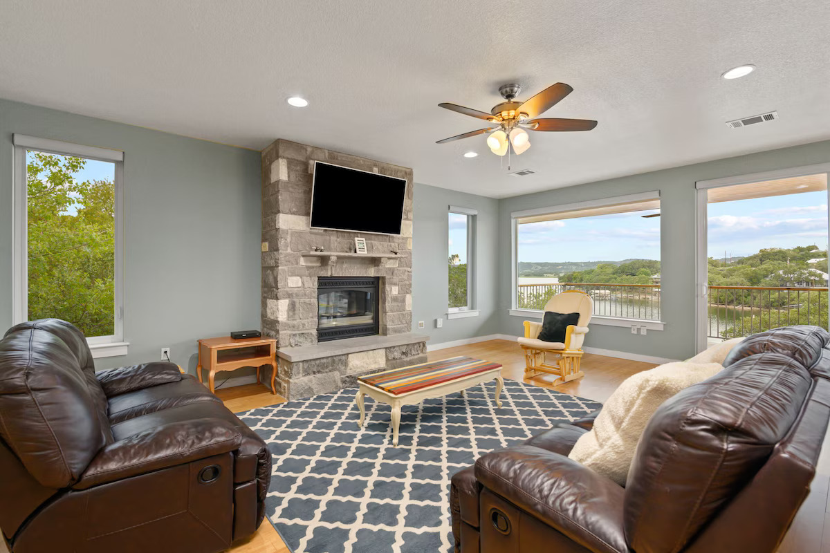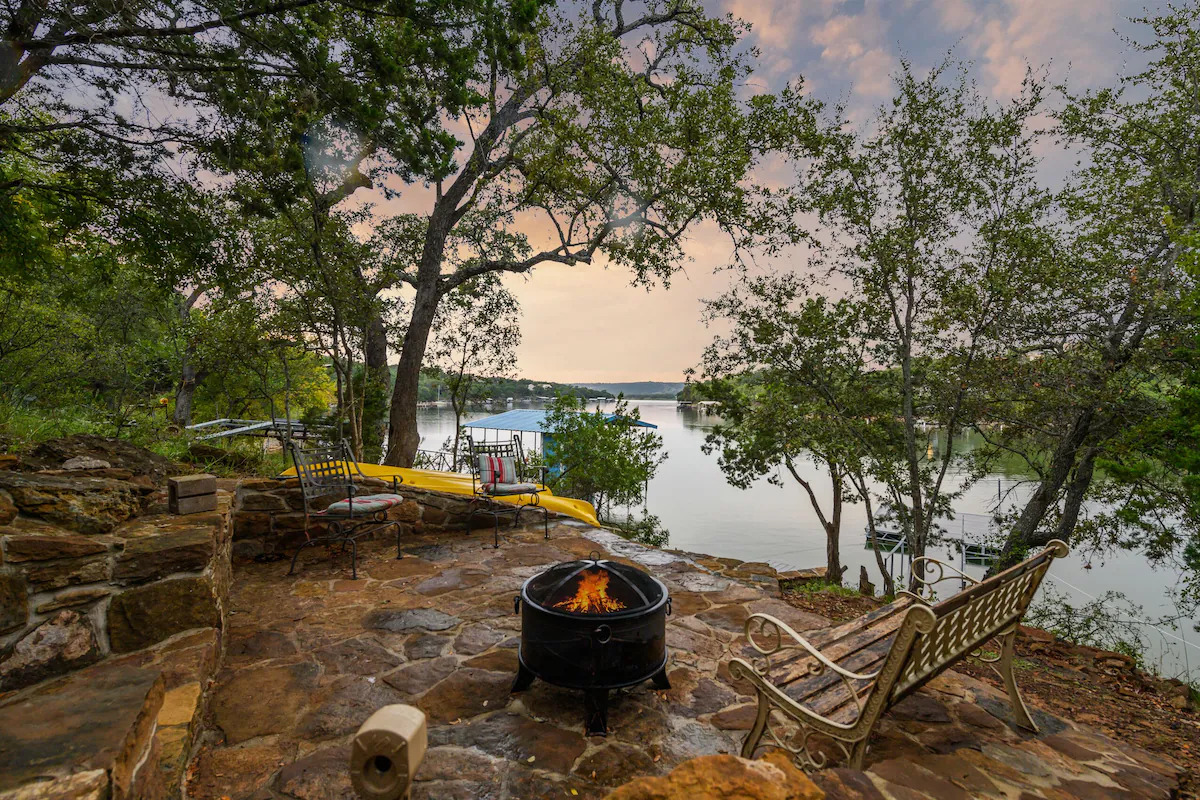 Outside are upper and lower covered balconies with seating. A flagstone patio with fire pit is in the backyard near the lake. The private floating dock is great for fishing, swimming, or just relaxing on the water. Lake Buchanan’s water level fluctuates with weather conditions. As of 2025 the lake is FULL.