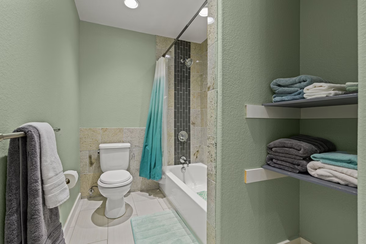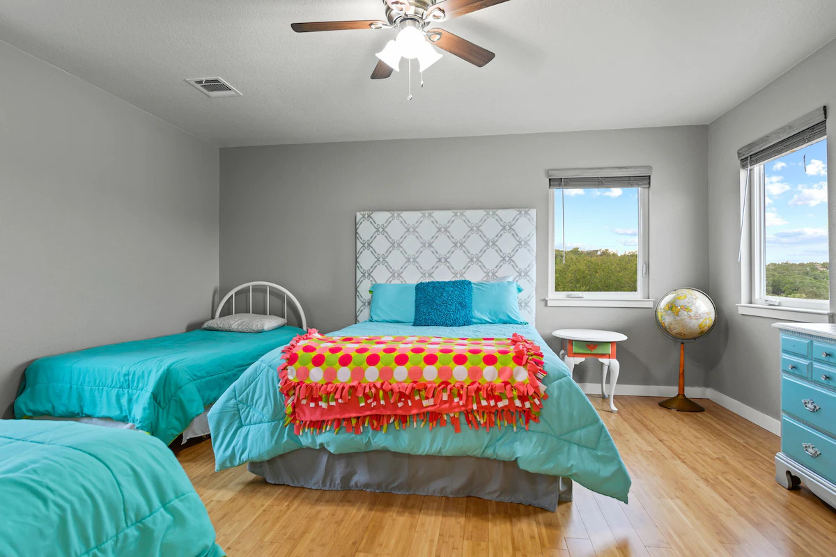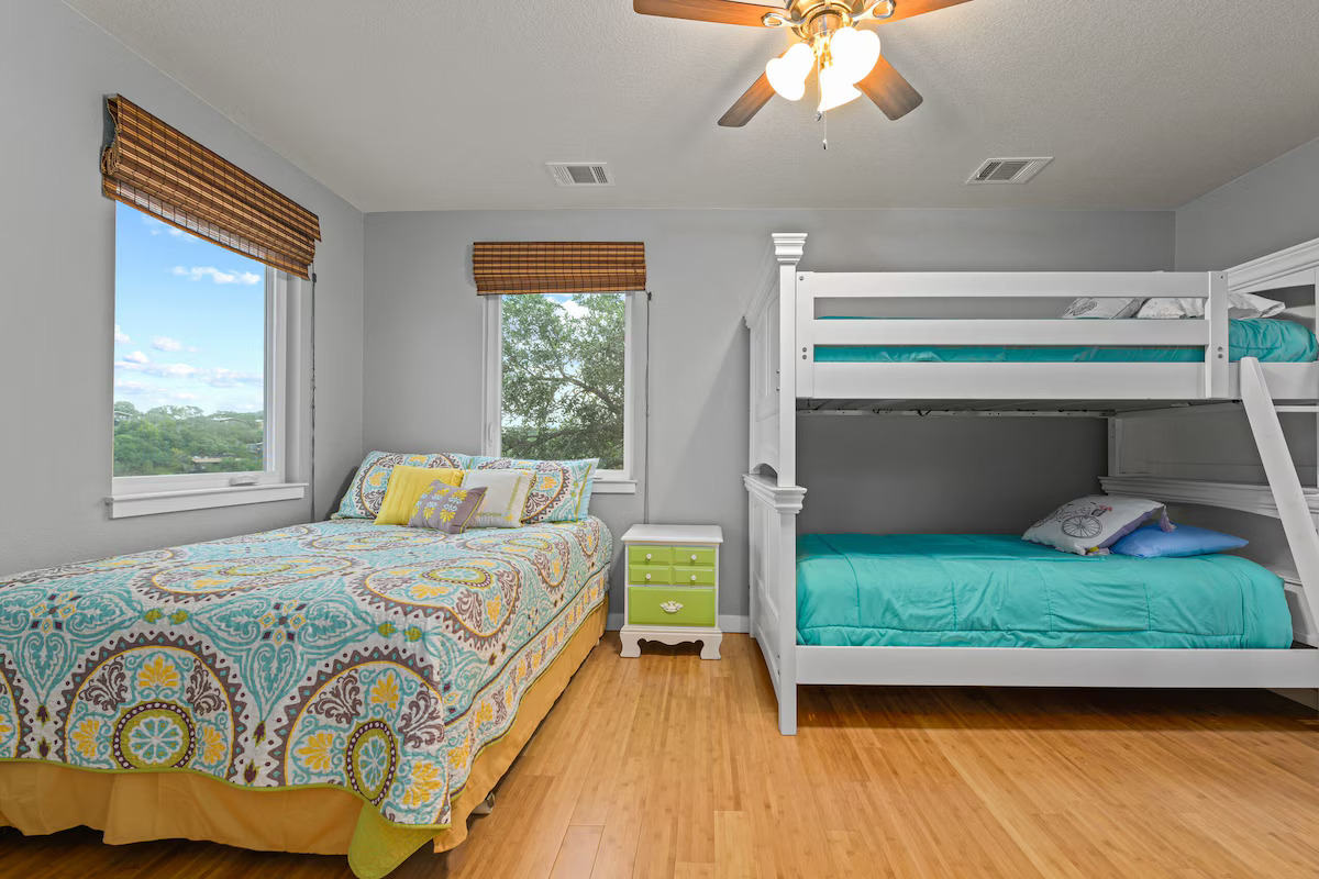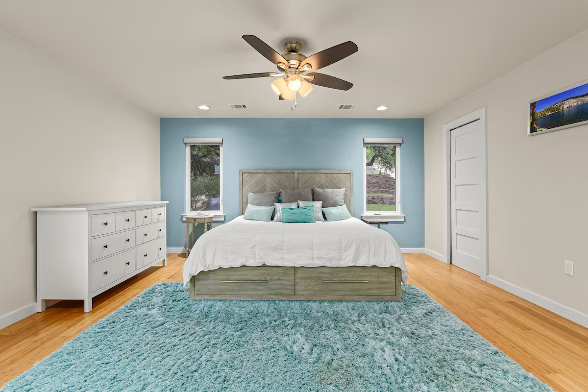Outside are upper and lower covered balconies with seating. A flagstone patio with fire pit is in the backyard near the lake. The private floating dock is great for fishing, swimming, or just relaxing on the water. Lake Buchanan’s water level fluctuates with weather conditions. As of 2025 the lake is FULL.