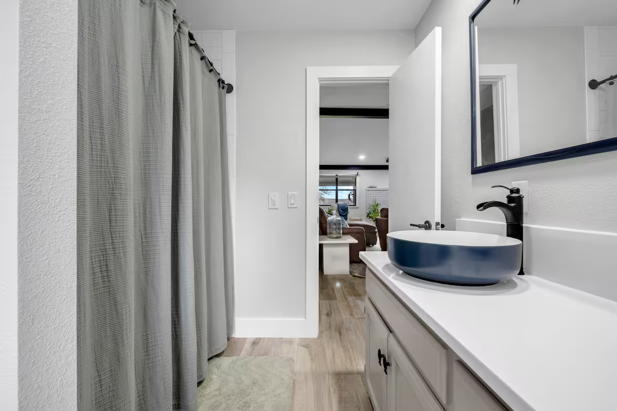 The space includes a king primary en suite and a queen guest room with a twin mattress. The guest bathroom is located central to the living room and next to guest bedroom. Living room has a large sectional and two recliners. The kitchen is well-equipped and fully stocked.