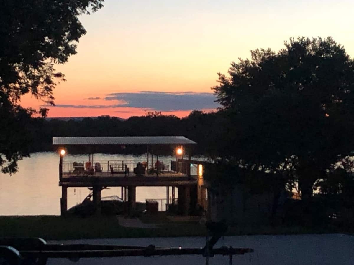 Tres Casas has so much to offer, and we are just getting down to the lakefront! This area includes a gazebo with table and chairs for lakeside relaxing. The lower part of the double decker boat dock allows plenty of seating, a bar area, a gas grill and sink. The lower level is a great place to hide out from the mid-day sun and enjoy the sounds of the lake. It is equipped with fans to keep the breeze moving on those hot Texas summer days. The large upper deck offers plenty of seating as well. It is a great spot for sunbathing during the day and spectacular Hill Country sunsets in the evenings.